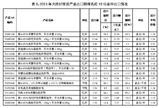 从天然纤维类产品出口主要品种看,各类型棉织布品种出口额排名居前。(详见表6)