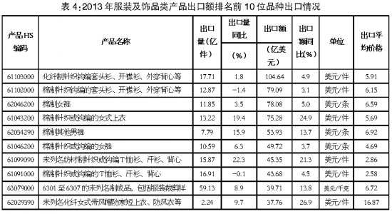 从出口主要品种来看,主要以棉质类服装为主。2013年出口额超10亿美元的品种共有8种。(详见表4)