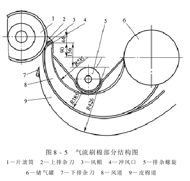 气流式锯齿花机刷棉部分的结构如图8-5所示。它主要由上排杂刀、排尘杂装置、储气罐、风道、风帽、冲风口、下排杂刀及皮棉道等组成。其刷棉部分是将风嘴喷出的高速气流,射向带纤维的锯齿,利用气流的冲击力,将棉纤维从锯齿上吹刷下来,再利用射流的附壁效应使棉纤维和气流一起进入皮棉道,送往集棉部分。