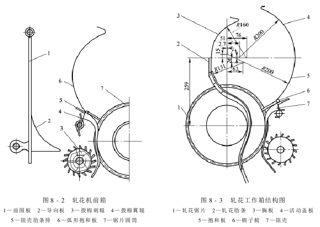 前箱位于轧花机的前下方。其作用是清除子棉中的铃壳、僵瓣棉、小花头和其他重杂物,以提高皮棉质量,爱护锯片不受损伤,并将子棉均匀地喂入轧花工作箱。前箱的结构如图8-2所示。前箱前面有一块薄钢板制成的前围板,它连同两侧面墙板一并挂在工作箱的墙板上。前围板下部装有一块弧形的子棉导向板,前箱和工作箱之间以弧形抱和板和阻壳肋条排相分隔。
