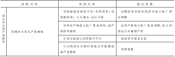 为了保证剑头正常使用,维修工必须每月用定规检查轨道的直线度。应常常检查剑头、剑带在轨道中自由滑动情况和剑带和导轨之间的横向间隙,间隙要求完量小,并按上机说明书进行调整,或抽出剑头剑带,观看剑头使用磨损状态,及时更换剑头上的损坏件(如弹簧、螺丝、开合器、底板等)。