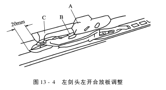 (1)在调整左剑头左开合板A的位置时,注意左剑头通过时其压线板只要能打开1mm就足够了,幸免左剑头造成不必要的磨损,如图13-4所示。