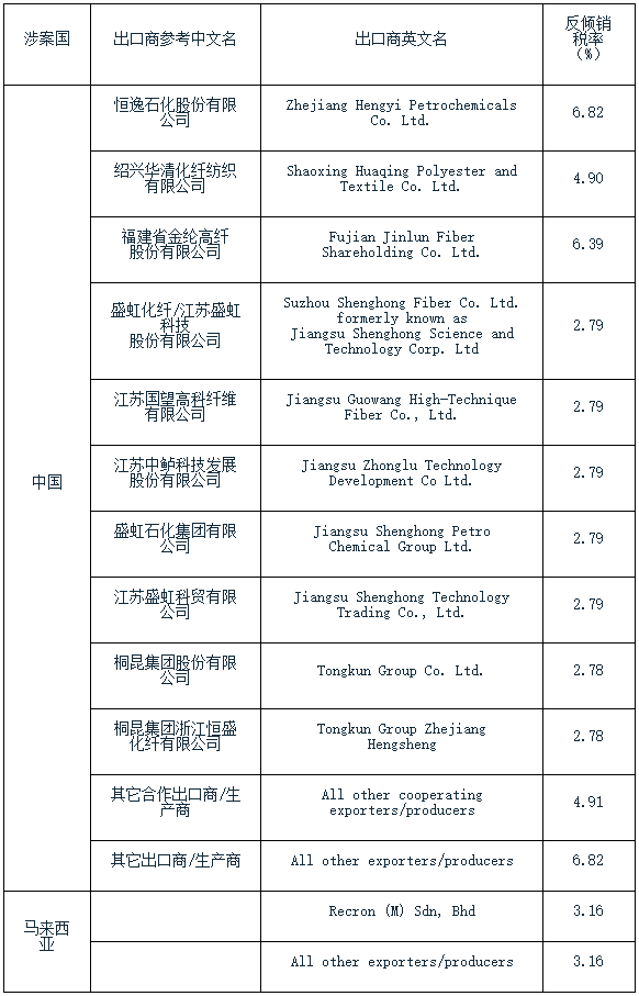 2022年1月26日,巴基斯坦国家关税委员会发布公告称,应巴基斯坦上诉法庭要求,对原产于或进口自中国和马来西亚的聚酯长丝纱线(Polyester Filament Yarn)重新进行反倾销调查,修改原终裁结果,调整对涉案产品的成本加运费(C&F)反倾销税,调整之后,中国为2.78-.82%,马来西亚为3.16%,税率详见附表,措施有效期至2022年8月25日。本案倾销调查期为2014年10月1日~2015年9月30日,损害调查期为2012年10月1月-2015年9月30日。本案涉及巴基斯坦税号5402.3300、5402.4700、5402.6200项下的产品,不包括彩色聚酯长丝纱线。