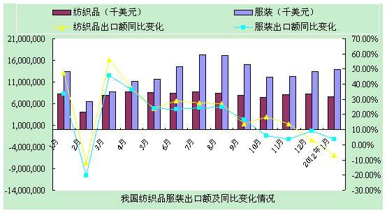 2012年1月,我国出口纺织纱线及织物76.76亿美元,出口服装及衣着附件138.42亿美元,分别比12月增长了-7.5%、2.9%,纺织品及服装出口增幅均降至个位数。1月,纺织品服装出口215.2亿美元,下降0.5%。其中纺织品出口下降6.8%,服装出口在同比基数较高的情况下仍保持增长,增幅为3.5%。