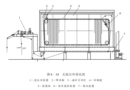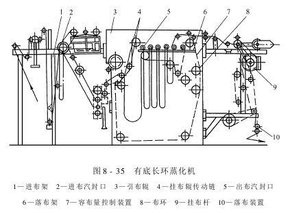 如图8-38所示为无底长环蒸化机,该机工作幅度有1800mm、2200mm、2800mm三种,速度20~60m/min,容布量180m,蒸化时间3~9min,工作温度100~210℃,环长1.5~2.2m。该机蒸化箱箱体为矩形,无底,双层隔板结构。隔板间为蒸汽通道,内置加热器起保温作用,可以幸免在箱体上形成冷凝水。由于蒸汽比空气轻,蒸汽浮于蒸箱上部,加上在蒸箱顶部喷出的蒸汽也向下排挤空气,使空气很快从箱体底部排出。箱内为高温蒸汽,箱外为室温空气,在箱体底部因箱内蒸汽凝聚形成雾层,使蒸箱内的蒸汽和箱外空气隔开,形成一道自然的汽封口,阻挡箱内蒸汽外逸和室外空气进入箱内,而织物则从箱体底部自由进出蒸箱。
