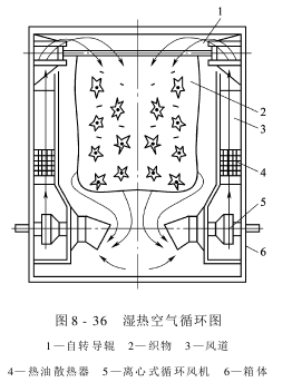 底结构,进出布处均有汽封口,蒸箱内底部有直接蒸汽喷管供汽、给湿。顶部有间接蒸汽保温,预防滴水。湿空气经箱体下部左右两侧的4台离心风机吸入,由箱体两侧夹层风道内的热油加热器加热,温度可达185℃,再从顶部喷向织物,蒸汽按如图8-36所示路线循环。当采纳饱和蒸汽汽蒸时,加热器内就不再需要输入热油,而是采纳机外水箱填料式饱和蒸汽发生装置,从两侧中部喷射饱和蒸汽,用于常温常压蒸化。