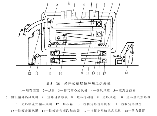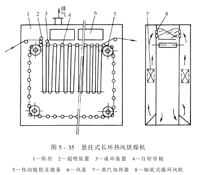 此类烘燥机按织物成环形状可分为长环和短环两种,若按织物悬挂层数可分为单层和多层。主要根据织物的厚薄轻重、张力大小要求以及成环难易等选用。