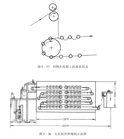 如图5-36所示。烘燥时布环较短,实际上织物是由导辊循环链上缓慢自转的导辊托着运行的。在两辊之间,织物稍呈悬挂状(图5-37)。因此,常把导辊称作托辊。热空气从织物上下的风嘴喷向织物两面,风速分别约为13m/s和7m/s,使织物短环不被吹乱。这种短环热风烘燥机除单层结构外,还有双层至五层的多层结构,如图5-38所示。这种烘燥机结构更紧凑,占地也少。但因烘房较高,操作检修不方便。