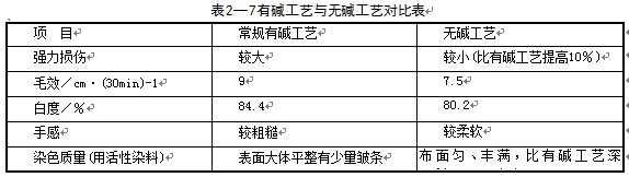 实施无碱退、煮、漂工艺是前处理工艺的进展方向,可减少污染,实现清洁生产;且织物强力损伤小,手感好,非常适合磨毛、免烫、防火后整理的产品。无碱漂白工艺对织物漂白效果略差,必要时可添加复漂工艺。无碱工艺成本略高于有碱工艺,但考虑环保处理,综合成本相应较低。