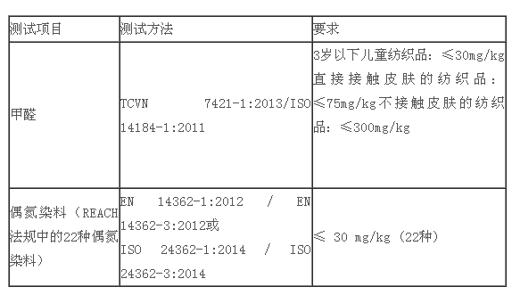 2015年9月7日,越南发布G/TBT/N/VNM/13/Rev.1号通告,修订2009年9月5日No.32/TT-BCT号通告中关于纺织品中甲醛和偶氮染料的限量要求、取样方法、测试方法及相关质量管理要求。