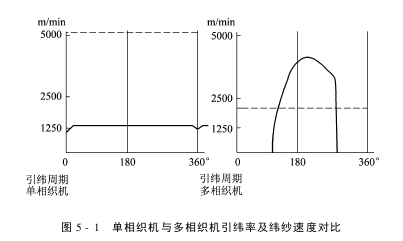面料集团)在1999年推出了M8300型多相喷气织机,可同时引入4根纬纱。和单相喷气织机的引纬速率2000m/min相比,其引纬速率超过5000m/min(图5-1),是国际上比较成熟多相织机,形成了产业化的销售。以下主要简单介绍M8300型多相喷气织机。
