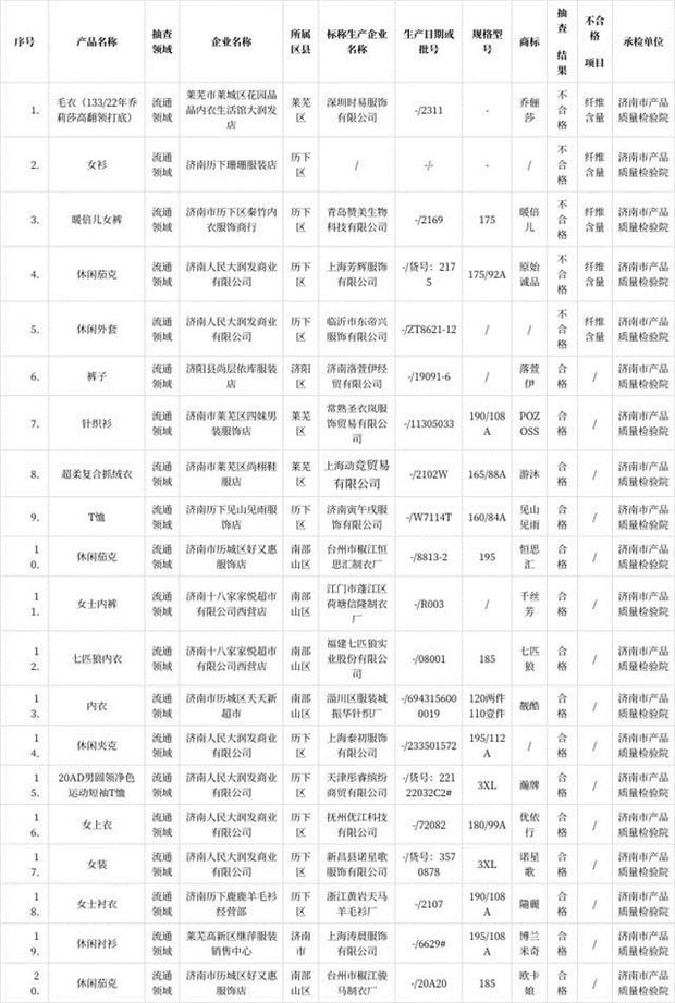 2023年4月19日,济南市市场监管局网站公布2022年中老年服装产品质量市级监督抽查结果。2022年市级监督抽查共抽查流通领域中老年服装产品20批次,发现5批次产品不符合相关标准的要求,不合格项目均为纤维含量项目。