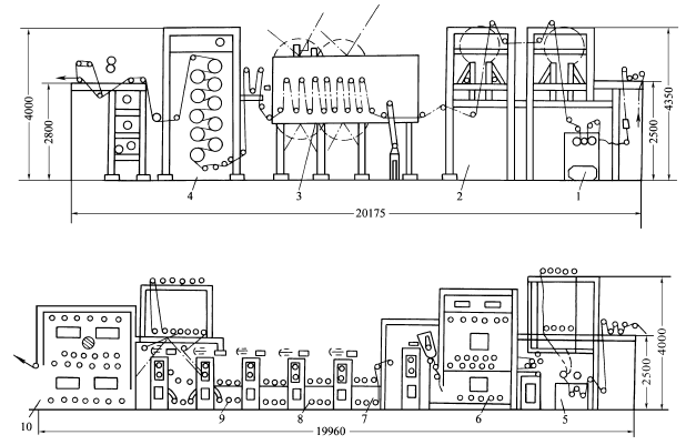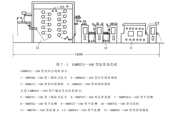 连续轧染机是能适应多种染料不同工艺要求连续轧染的一类平幅上色联合机。这类设备适用性强,可一机多用,生产效率高,产品质量好,操作维修较方便,是较为理想的上色设备。这种设备的种类较多,组成各有差异,但其主要组成单元机不外乎以下几种:平幅进布装置、平幅浸轧机、红外线烘燥机、热风烘燥机、汽蒸箱、焙烘机、平幅水洗机和烘筒烘燥机等。在选择时,可根据不同的工艺要求,设计出不同组合的轧染联合机。图7-1所示LMH321—160型连续上色机就是其中的一种。此机可供棉及棉型织物等进行活性染料、还原染料、不溶性偶氮染料等的连续轧染,也可进行一般不需汽蒸的可溶性还原染料的连续轧染。