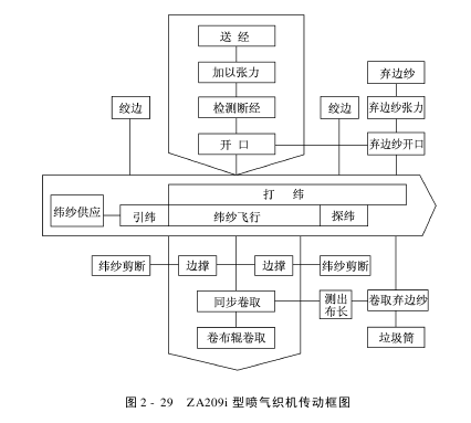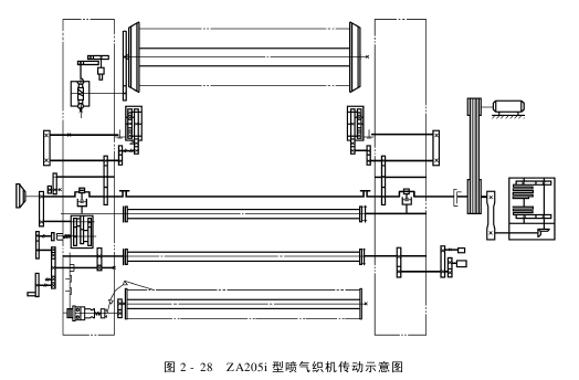 ZA200系列喷气织机传动系统:电动机通过三角带将动力传递给织机主轴,主轴再传递给织机上的各个机构。织机在点动和自动寻纬期间的休闲是通过5Hz变频电源驱动主电动机,然后主电动机再将动力传递给织机各个机构。