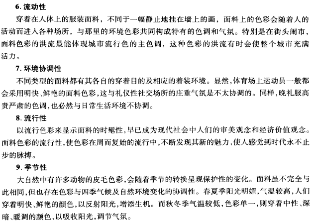 因此,在进行织物色彩设计时,不能仅考虑正面的装饰效果,还必须注意两侧及背面的色彩处理,而且要照顾到每个角度的视觉平衡,使之始终都能保持整体协调的感觉。