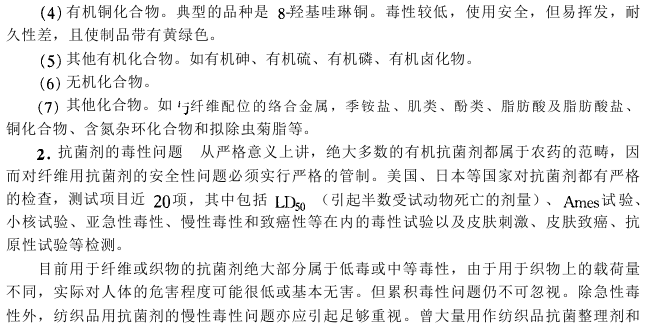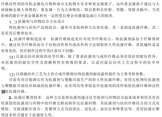 抑菌织物进展于20世纪初期,第二次大战以后,美国、日本等国家先后投入大量资金和人力,进行抑菌织物的研究。自80年代以来,开始出现通过化学纤维的高分子结构改性和共混改性的方法制取持久性抑菌纤维的方法,其中以共混方式为主。早期用于化学纤维共混纺化纤织物丝的抑菌剂一般均为含金属离子的贴合物,其中有不少抑菌剂含有重金属离子近年来随着人们环境爱护意识的增强,重金属离子对人体的生态毒性问题已逐渐引起人们的重视,抑菌效果好但毒性较大的含重金属离子抑菌剂已被逐渐淘汰,取而代之的是以和银离子结合具有抑菌性的沸石作为和合成纤维共混改性的主要抑菌剂,这种抑菌剂有广谱抑菌效果,对人体无害,而且热稳定性好。近10年来,抑菌效率更高、使用更为方便、安全性更好的抑菌后整理剂不断涌现,并在实际应用中不断被筛选。