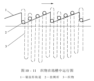 ②挂绸装置:挂绸装置包含挂绸杆、锯齿装置及链轮链条机构等。挂绸杆由位于两侧的链轮链条机构驱动。链条为扁平状,挂绸杆插入链条中间的长圆形导槽内,循环链条由链轮传动缓慢地向前移动,挂绸杆也就随着链条一起移动,其运行速度在10~25m/min的范围内可调节,挂绸杆是一椭圆形空心不锈钢管,挂绸杆之间相隔距离10mm,练槽中可容200根挂绸杆,精练槽容绸量约为400~500m。挂绸杆在链条夹持下向前移动的同时在垂直方向还受到锯齿轨道的支撑作用,如图10-11所示。