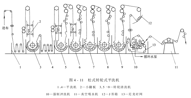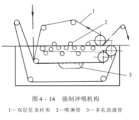 在松式平洗机的末级装有一个强制冲吸机构(图4-14)。它由双层尼龙衬网、喷淋管和多孔吸口组成。织物导入两层履带形尼龙衬网后,两面由上下喷淋管强制冲洗。织物中的洗液,则由多孔真空吸口吸去,达到提高清洗效率的目的。
