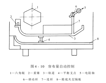 为了保证每格洗液槽同步,必须操纵每格的容布量。图4-10所示是容布量自动操纵的原理图。调节重锤,使之和设定的容布量平衡。当容布量发生变化时,堆布轨道就会绕支点上下摆动,通过连杆、移动杆,把这种摆动转换为电阻轴的圆周休闲,使电阻发生变化而调整车速的快慢,达到容布量自动操纵的目的。
