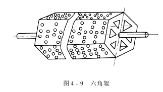 全机由多格蒸洗箱组成。进出布处都设有水封,可使蒸洗温度有所提高。各格蒸洗箱单独传动,并有单独洗槽,便于更换洗液。蒸洗箱用不锈钢板制成,其结构如图4-8所示。送布用的六角辊如图4-9所示,是用厚度为2.5mm的不锈钢板焊成的,直径为500mm,两端都能进洗液。辊面上钻有多排直径为25mm的圆孔,也可进出洗液。当六角辊将织物牵引过来时,洗液因自身重量自然地从圆孔中流出,织物也就从辊面脱离下来,折叠堆放在轨道上,按洗液流动方向沿轨道向前运行。