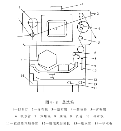 图4-7所示为松式六角辊式平洗机,适用于中长化学纤维织物整理过程中的前后处理,如退浆、煮练、上色及后整理后的松式水洗,也可用作纯棉或化学纤维织物的松式水洗或松式上色。