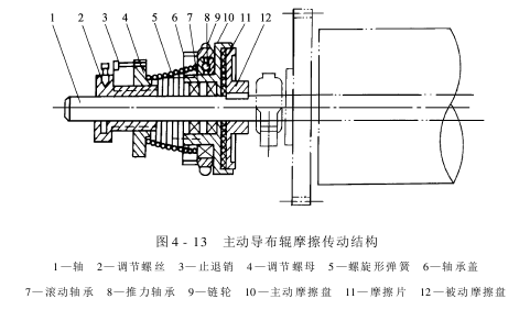 图4-13所示是主动导布辊摩擦传动的结构图。依靠调节螺丝、调节螺母和弹簧,可调节摩擦盘传递的力矩,从而达到操纵织物张力的目的。
