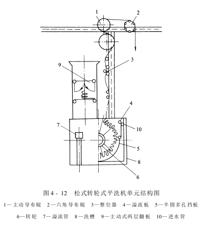 图4-11所示为松式转轮式平洗机,此机结构简单,操作方便,适用于中长化学纤维混纺化纤织物织物的退浆和平洗。图4-12所示是它的单元结构图。织物由六角导布辊摆入小翻板,堆置36s后落到转轮的叶片上,叶片共有10片,长度为90mm,转轮空心轴直径为300mm,轴面布满圆形小孔,便于洗液交换。织物在转轮槽中浸泡清洗3min后,经螺纹扩幅辊、整位器,进入主动导布辊,成S形运行,进入下一格。