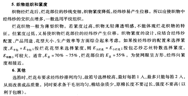 织物的用途和风格选择。对用于装饰的烂花织物,烂花面积较大,同时考虑到织物的悬垂性,可选样特数较大的涤纶丝,如7.6tex(68旦)等。对用于夏季工作装用的烂花织物,烂花面积小,同时考虑到织物的凹凸效果,则选择特数较小的涤纶丝,如5tex(45旦)等。