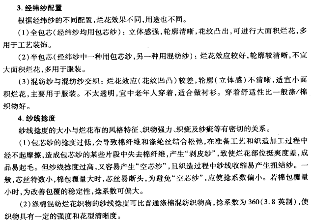 涤纶芯丝的线密度直接影响烂花产品的风格。如果涤纶丝太细,则烂花部位细而软,但如果太粗,成员缺少轻快感。所以涤纶芯丝的线密度应根据
