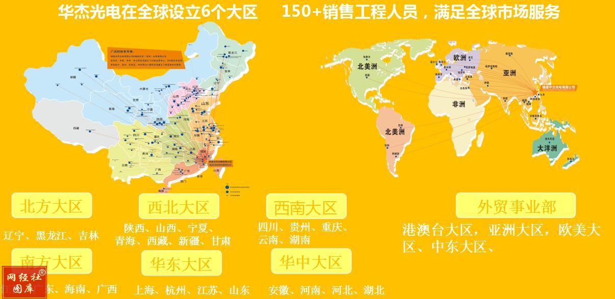 华杰光电在2012年正式成立海峡彩亮光电产业园,并在华东、华南、华中、华北等区域建立了近百家省级经销商,满足了新疆,内蒙、宁夏、西藏、青海偏远地区对显示屏的需求。华杰拥有2000多家线下展厅,并在东南亚、欧洲、美洲、中东等35个国际区域建立了数百家的代理商。其中在土耳其、俄罗斯、伊朗、迪拜、英国、荷兰、新加坡等区域的业务成为华杰进军国际市场重要战略布局。