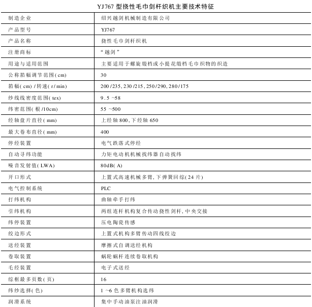 YJ767型挠性毛巾剑杆织机是绍兴越剑机械制造有限公司在原YJ2000型织机的基础上结合国外先进织机和用户意见的基础上自主开发的新一代剑杆毛巾织机,该机具有结构稳固,技术性能稳定可靠,毛高调节范围大,品种适应性广,操作方便,维护简单的特点。
