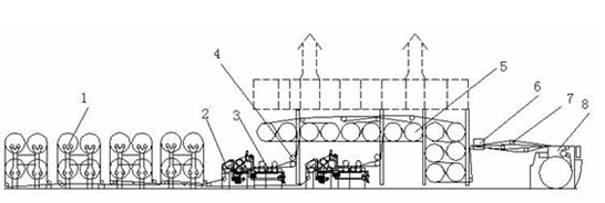 经纱在浆纱机上进行上浆,典型的上浆工艺流程为:纺纱线从位于经轴架1上的整经轴中退绕出来,经过张力自动调节装置2,进入浆槽3上浆,湿浆纱经湿分绞辊4分绞和烘燥装置5烘燥后通过上蜡装置6进行后上蜡,干燥的经纱在干分绞区7被分别成几层,后在车头8卷绕成织轴。
