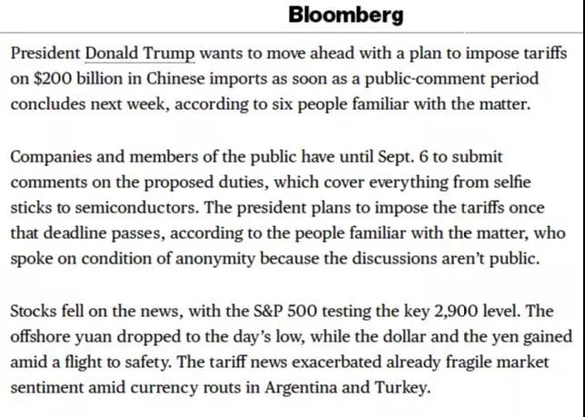 彭博援引6名知情人士的消息称,美国总统唐纳德·特朗普希望在下周的公共评论期结束后,尽快出台一项计划,对进口自中国的2000亿美元商品征收关税。