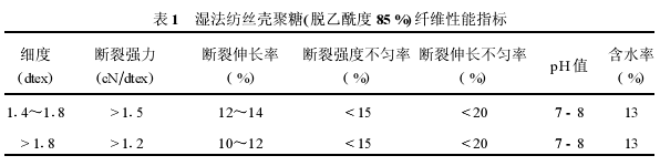 国家的高级医疗用壳聚糖纤维制品,大多按1000美元/kg以上的价格在销售;国内亮聚糖纤维(脱乙酰度80%-100%)的售价为1000-2300元/kg。由工业化生产、按湿法纺丝制得的壳聚糖纤维(脱乙酰度97%-100%),其湿态强度可达4.3cN/dtex,干态强度达6.3cN/dtex,断裂伸长率26%,熔点360℃,标准状态下纤维的含水率13.0%-13.8%,吸水率65%(参见表1)。