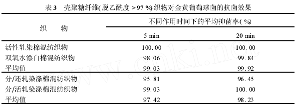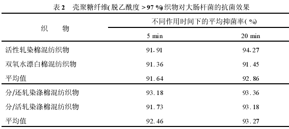 通过对壳聚糖纤维(脱乙酰度>97%)含量为1%的棉织物和涤棉织物印染成品的抑菌实验,还发觉当壳聚糖纤维在织物中的含量为1%时,织物对金黄葡萄球菌有抑菌效果,对大肠杆菌则无抑菌效果(抑菌率<40%=,这说明在壳聚糖纤维混