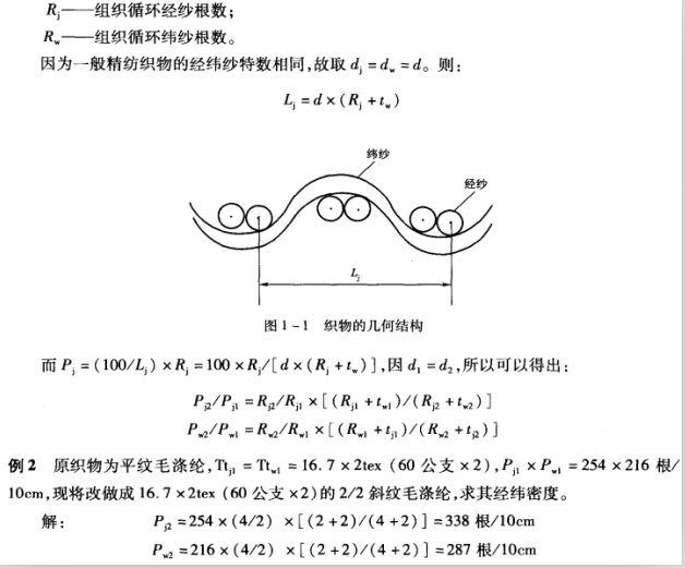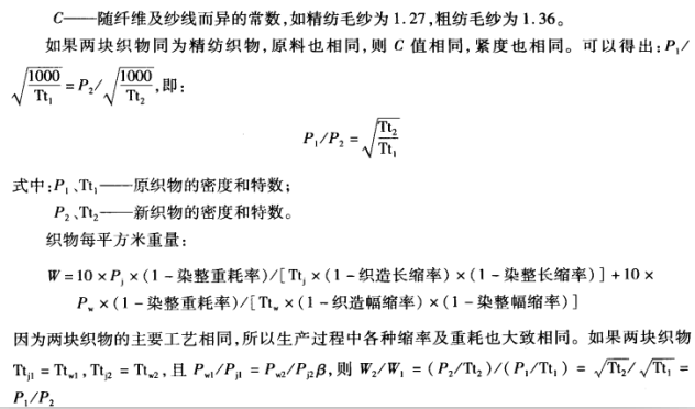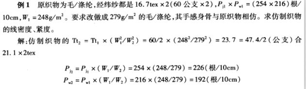 所谓相似织物就是指两块织物的品种相同,手感身骨相仿,而要求更改织物的重量。这样,两块织物的原材料相同,主要工艺也相同,即可根据原织物的数据计算新织物的纱特和密度。