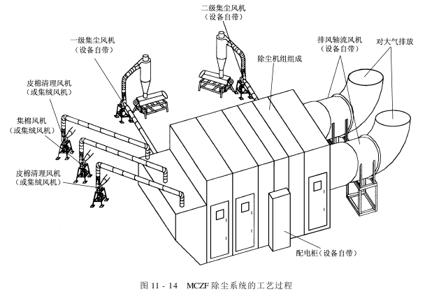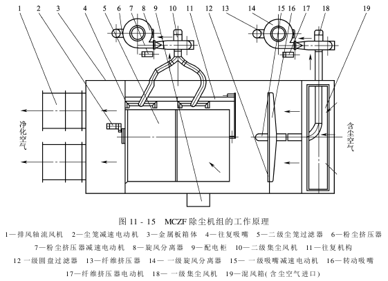 MCZF除尘系统工艺过程如图11-14所示,MCZF除尘机组工作原理如图11-15所示。