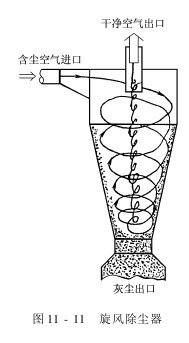 旋风除尘器(图11-11),又称沙克龙,材料由白铁皮整理而成,结构由圆筒体、圆锥体、排风管、进风口及盛灰斗组成。筒体、锥体、排出管和排灰口位于同一条轴线上。其利用含尘气流作旋转休闲时,作用于尘粒上的惯性离心力将粉尘从气体中分别出来,当含尘空气以较高的速度沿下旋形进口切向进入后,在内外圆筒之间做自上而下的螺旋形旋转休闲,较大的尘粒在离心力的作用下,被甩到筒体内壁,和壁面摩擦、碰撞而失去速度,在重力和自上而下气流的作用下,落究竟部盛灰斗处排出。而净化后的空气,随锥体部分的收缩而逐渐向锥体中心靠拢,在快接近底部时,又受究竟部所阻,旋转向上而形成返卷气流,后由排风管排出。