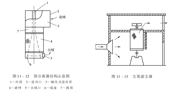 预分别器(图11-12)是集沙克龙和布袋除尘原理于一身的一种设备。预分别器的优点是细小粉尘和绝大部分空气透过筛网排出,中粗颗粒的纤维性尘杂,被阻留在筛网的内表面,随少部分空气继续向下旋转,由尘绒排杂口排出,有用纤维便于清理回收,改变滤网目数可有效地回收棉花整理厂各环节的尘绒,且阻力较小;缺点是除尘效率低,所以一般都作为二级除尘的预处理。