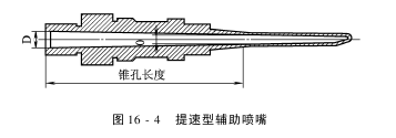 根据上述流体力学连续方程基本原理,对辅喷气流的通道进行了优化设计。图16-4所示为提速型辅助喷嘴的结构图,其渐缩形气流通道的大小端内径之比的取值范围为D/d=1.02~3.0。