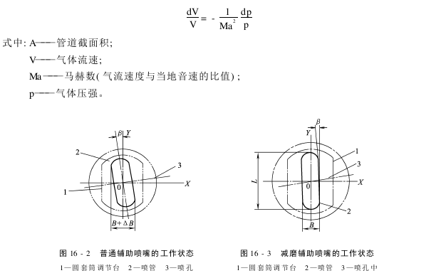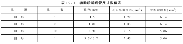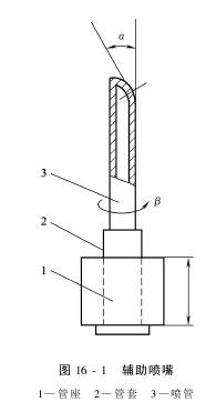 辅助喷嘴由管座1、管套2及喷管3等组成。其中喷管头端压扁成形,喷孔位置在和管身呈α角的斜面上,α称为喷射角;喷管和管套一般用树脂胶固结,两者按肯定的角度β定位。称为喷向角,如图16-1所示。