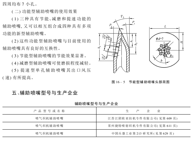 从生产实践角度看,各种孔形的辅助喷嘴的气流性能各有千秋,但也确有差异;它表明上各喷气织机制造厂家对喷气引纬技术的应用有所不同,体现自有的价值。如亚洲产的喷气织机多采纳单孔或双孔的辅助喷嘴;而欧洲产的喷气织机则多采纳多孔或非圆形孔的辅助喷嘴。几种常见的辅助喷嘴进行测绘所得的数值有见表16-1,供参考。