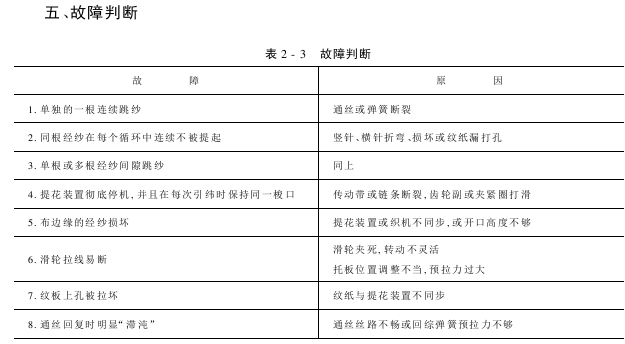 应该定期检查提花装置,以保证机器的各部件处于良好的工作状态。非常需要检查通丝和滑轮、纹纸的工作状态是否正常,通丝在目板中的线段是否有损坏现象,回综件四周不同意有灰尘脏物,用压缩空气定期清扫。