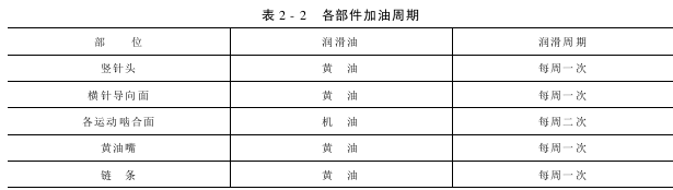 加油点为休闲啮合面、各个黄油嘴及链轮,表2-2列出了各加油点加油周期。