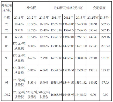 综上所述,实施滑准税后,我国进口棉花价格逐年上涨,不过增长幅度放缓,2012年增长幅度为2.58%,2013年增长幅度为2.53%。