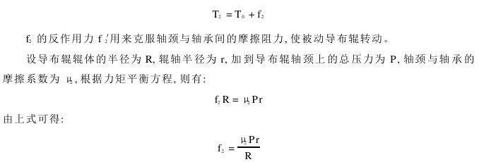 如图2-4所示。设织物进入导布辊一端的经向张力为T0 ,引出导布辊一端的经向张力为T3 ,导布辊辊面和织物间的静摩擦力为f3 ,驱动导布辊转动的外加力矩为M,导布辊辊体的半径为R,显然: