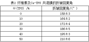 表2为纤维素膜及Ce-TPU共混膜的折皱回复角测试结果。