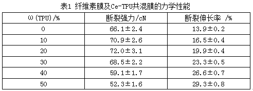 表1为纤维素膜及Ce-TPU共混膜的断裂强力和断裂伸长率测试结果。
