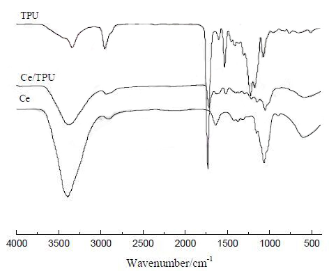 图3 Ce膜、TPU膜及Ce-TPU共混膜的红外完谱图