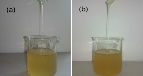 溶化后的纤维素溶液为透明的淡黄色,冷却至室温,黏度变大,放置2个月不会发生固化。共混溶液呈现稳定均一的透明状态,放置2个月未出现相分别现象,但由于TPU氧化的原因,共混溶液的颜色略微加深。由图可以看到,放置2个月后,共混溶液的流动性仍保持优良,符合制膜要求。